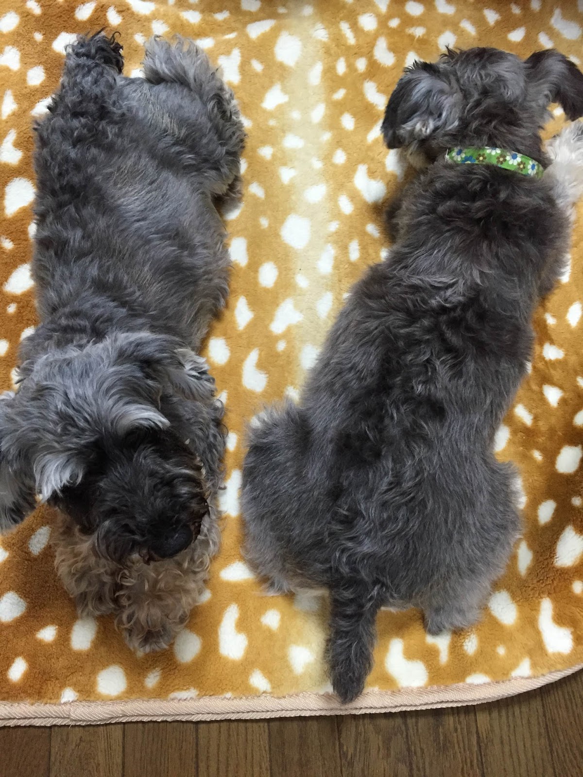 トライアルにあたり私達が唯一心配だったことは、我が家には既にシュナウザーの男の子、ポッキーがいること。とってもとっても甘えん坊だったので上手くやっていけるかな?お互いが負担にならないかな?ということでした。